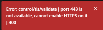 Error: control/tls/validate | port 443 is not available, cannot enable HTTPS on it | 400