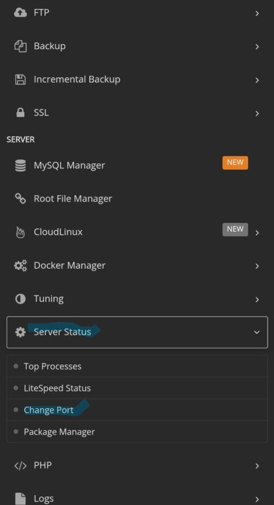 选项在server status下的change port中,进入后把port下的数值改为8443。