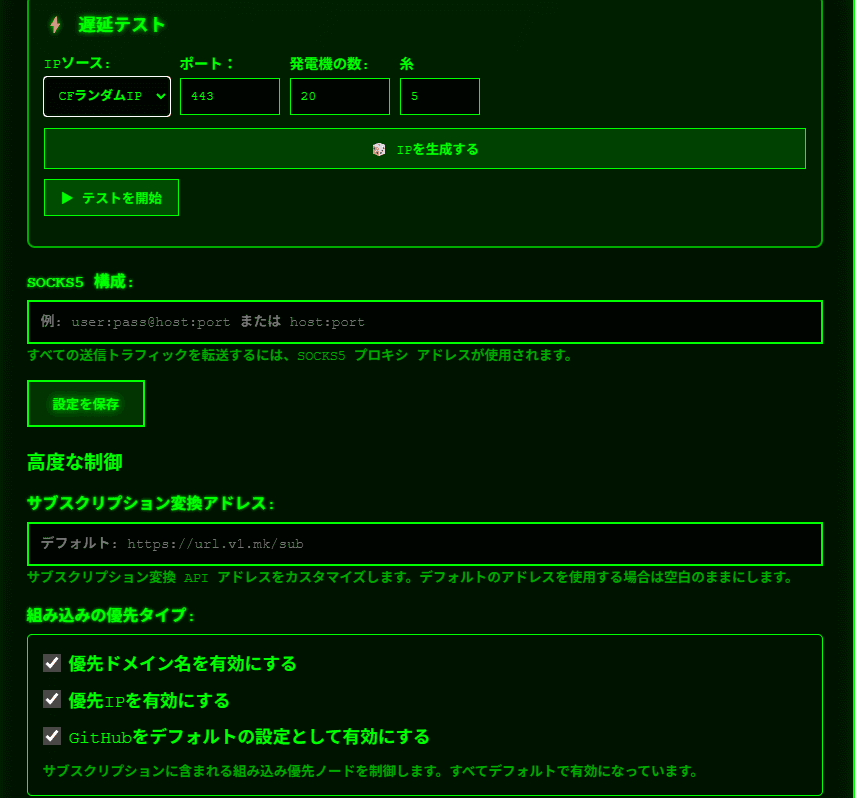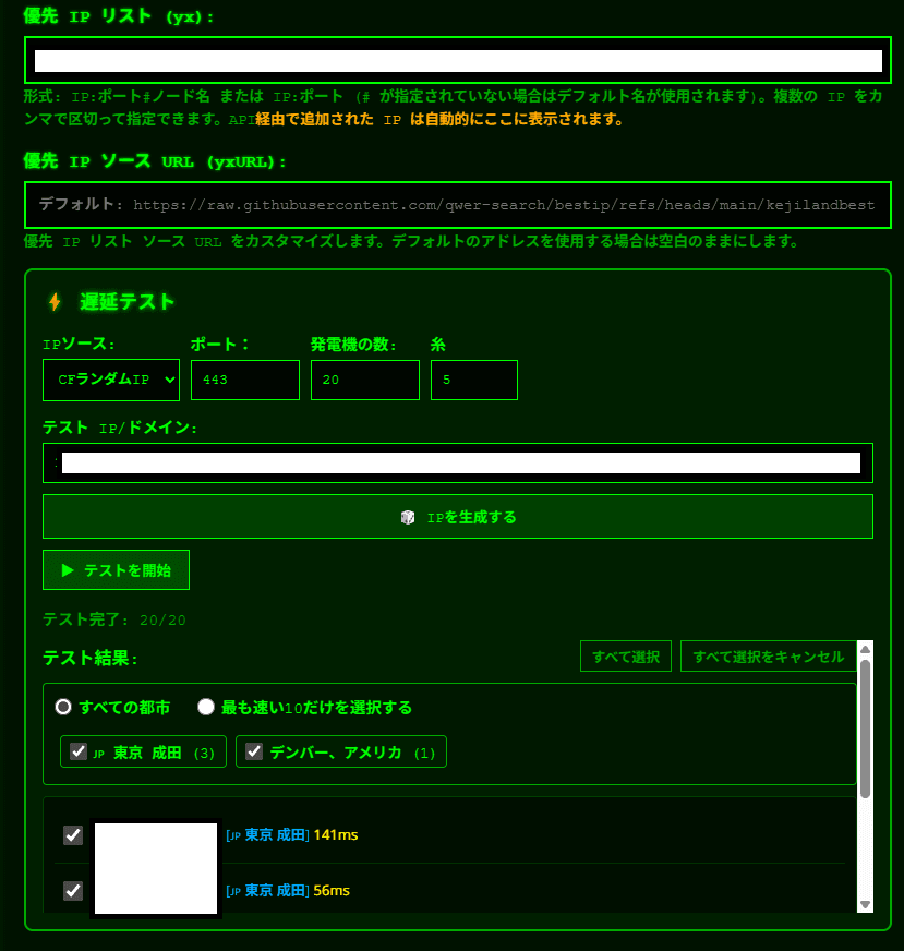 「遅延テスト」欄で「CFランダムIP」を選び、「IPを生成する」とクリック。
