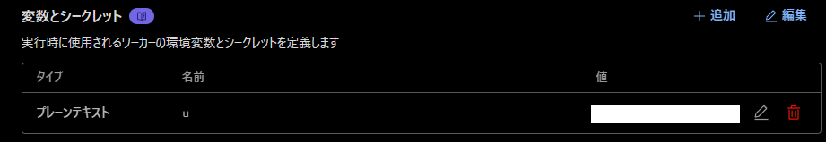 3. 環境変数の設定: 「設定」→「変数とシークレット」にて、プロジェクト指定の変数uを追加します。値は自由です。