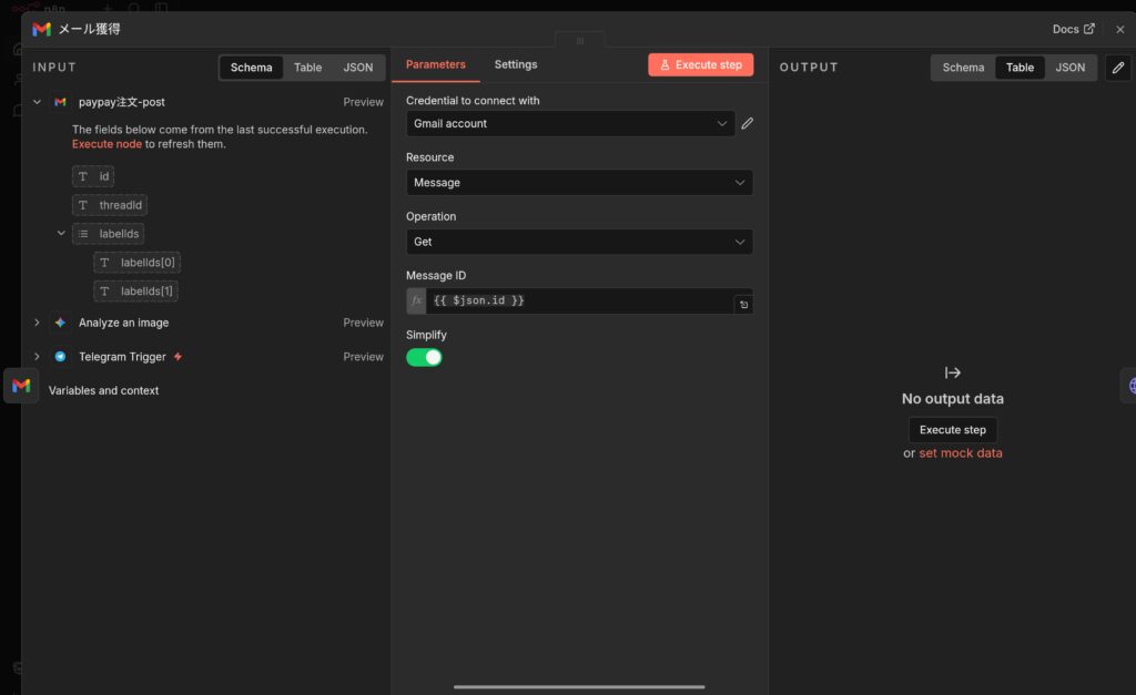 同じGmailのアクションから「Get messege」を使用し、GetするメールのIDを指定します。IDに唯一性がありますから、間違って別のメールをキャッチする心配もありません。