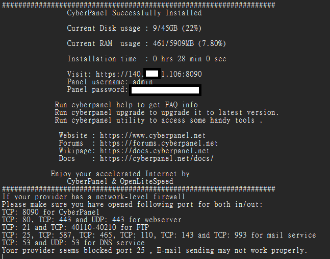 sudo su - -c "sh <(curl https://cyberpanel.net/install.sh || wget -O - https://cyberpanel.net/install.sh)"之后就是非常漫长的等待,漫长到我一度以为要失败了。