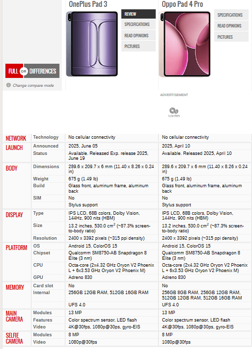 以及,经确认,Oneplus Pad 3和OPPO Pad4 pro的部件可以兼容。从下方页面来看,我甚至可以直接认为这两款就是同一个东西。