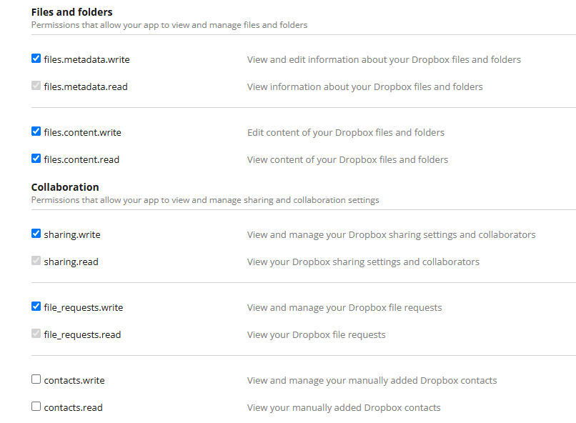- Dropbox②:Dropbox如果有授权其他app作为备份文件保管地点的,为了在ownCloud里也能顺利访问,在dropbox.com/developers创建app时,需要把一部分权限点上。(我是按照下图设置的)