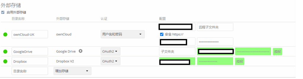 下图可以看到,目前我挂载了3个云存储在我的ownCloud中。