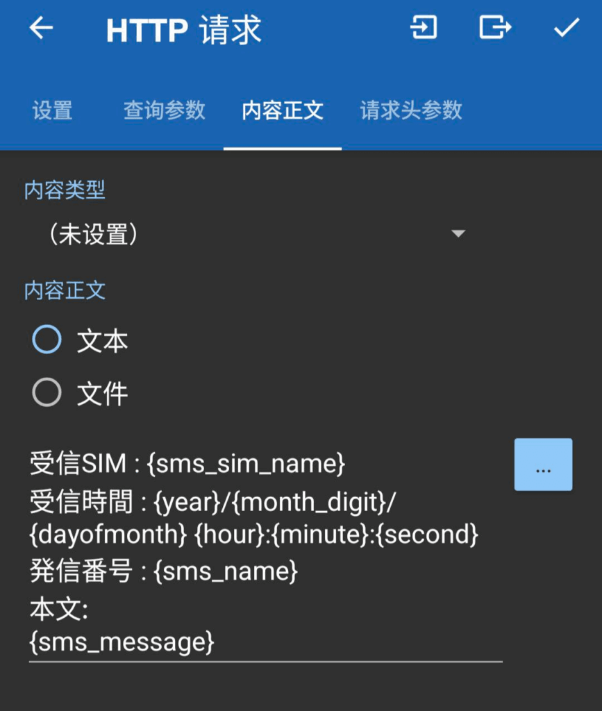输入的网址内容基本和刚才一样,只要把<text>的内容换成短信的各个要素即可。设置时可以点链接边上那个<…>来选择并插入。