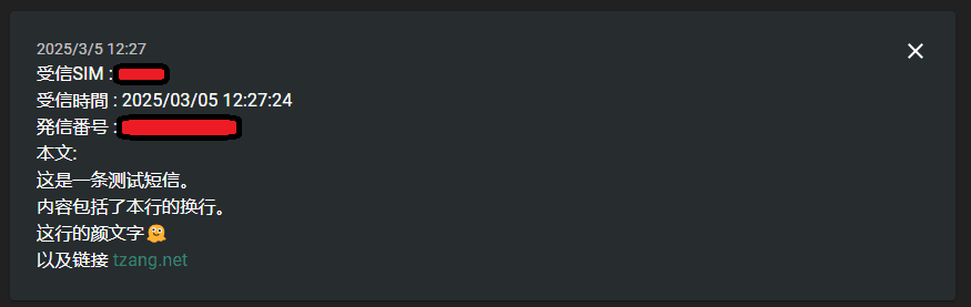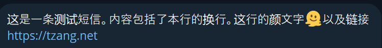 https://api.telegram.org/bot<token>/sendMessage?chat_id=<chat id>&text={sms_message}你也可以插入别的东西,比如时间,发信人号码之类的,但是不能换行。