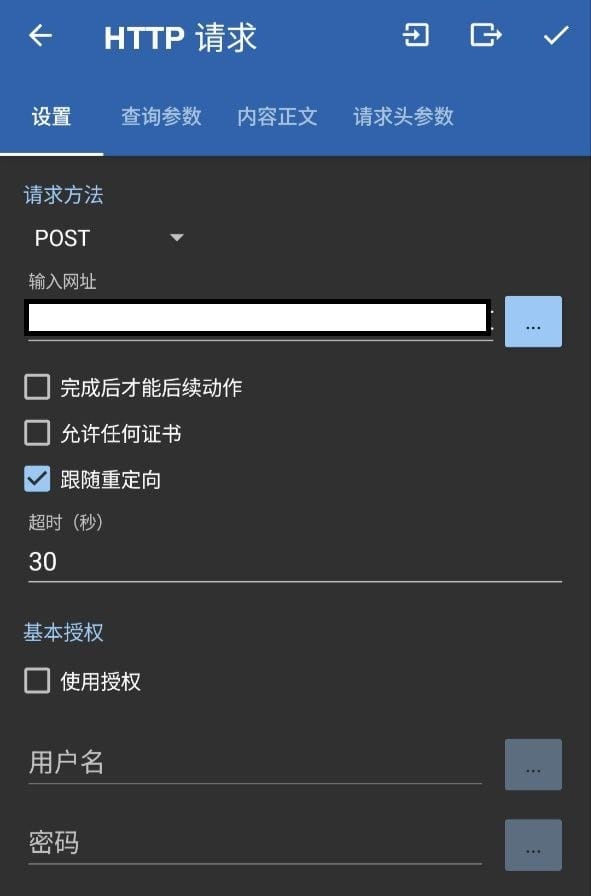 ②-1 网址部分输入ntfy的订阅主题。另外,这里似乎支持带Basic Auth的ntfy(也就是下图的“基本授权”),有兴趣的可以试试。