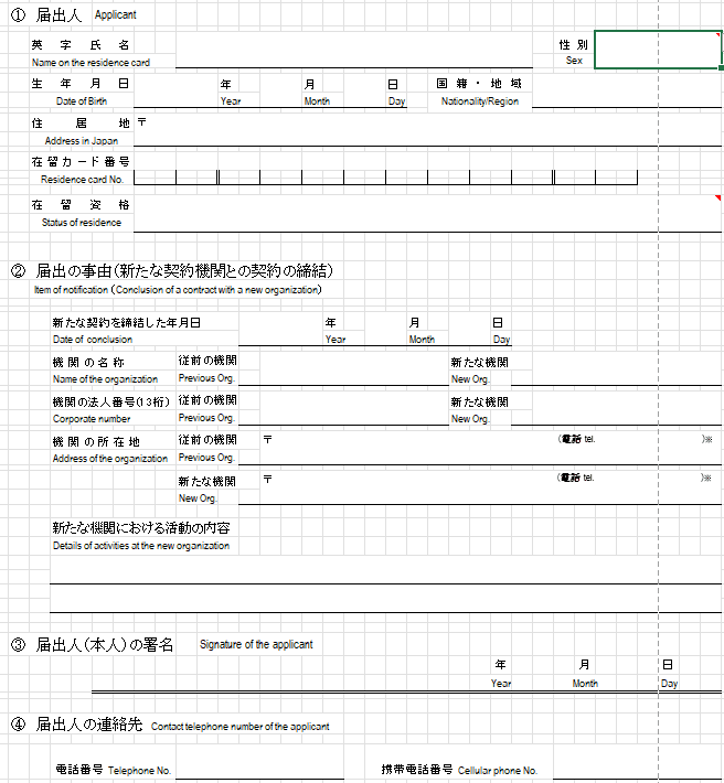 所属(契約)機関に関する届出(高度専門職1号イ又はロ、高度専門職2号(イ又はロ)、研究、技術・人文知識・国際業務、介護、興行、技能、特定技能)